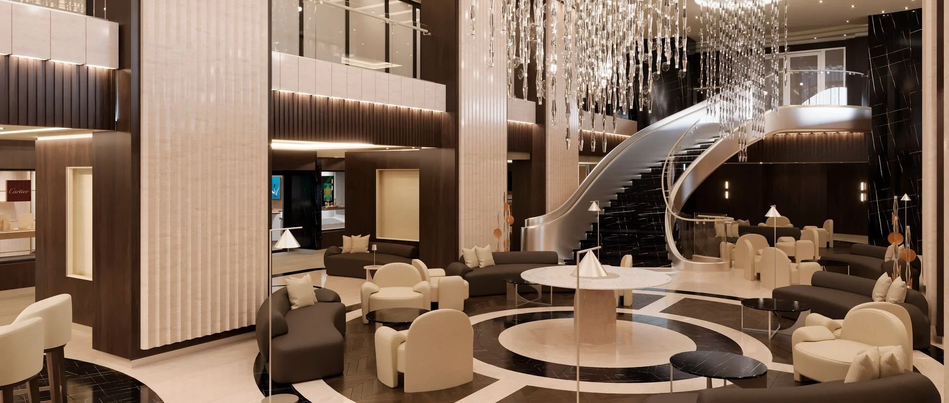 At the heart of Explora I and II is the iconic Lobby Bar with its iconic staircase. While the concept remains true, the design is completely new, with a sweeping curved staircase now dominating the space. As mentioned previously guest services will now be joined by the Future Journeys team. Either side of this hub are the boutiques which see the return of Rolex and Cartier the introduction of Chopard.